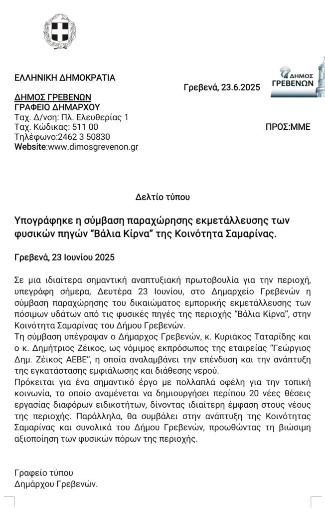 Δελτίο τύπου: Δήμος Γρεβενών-Υπογράφηκε η σύμβαση παραχώρησης εκμετάλλευσης των φυσικών πηγών “Βάλια Κίρνα” της Κοινότητα Σαμαρίνας.
