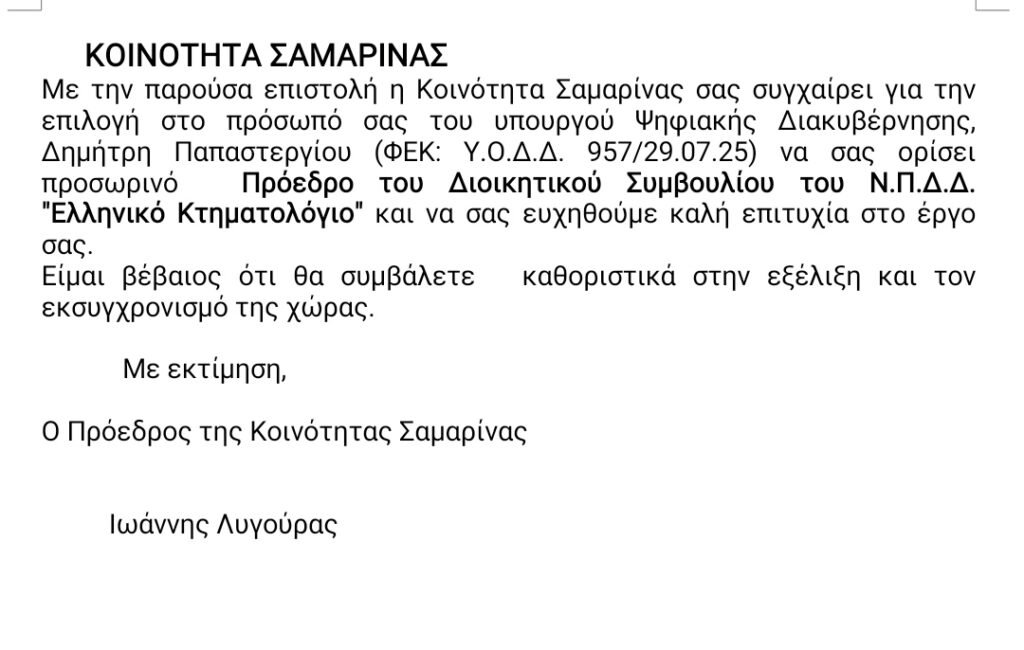 ΕΥΧΕΤΗΡΙΟ ΜΗΝΥΜΑ ΤΗΣ ΚΟΙΝΟΤΗΤΑΣ ΣΑΜΑΡΙΝΑΣ ΣΤΟΝ ΠΡΟΕΔΡΟ ΤΟΥ ΕΛΛΗΝΙΚΟΥ ΚΤΗΜΑΤΟΛΟΓΙΟΥ κ. ΘΑΝΟ ΛΙΠΑ.
