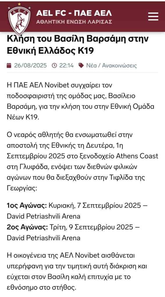 Κλήση του Βασίλη Βαρσάμη στην Εθνική Κ19.